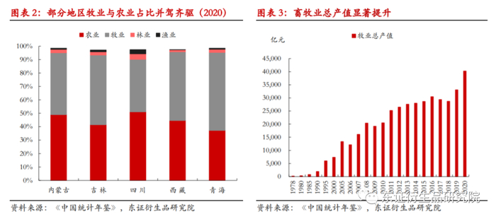 在内蒙古、吉林、西藏、青海等地区,畜牧业已与农业并驾齐驱,甚至超过农业在农林牧渔总产值占比。2020年,青海省牧业占比高达58.2%,内蒙古、吉林、西藏、四川等地区牧业产值占比分别为46.2%、52.0%、51.93%以及39.2%。
