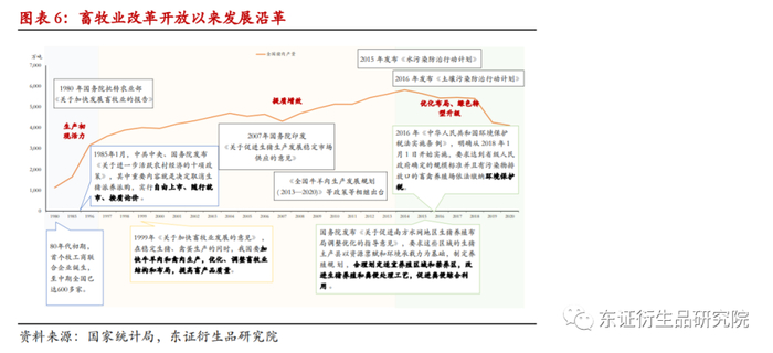 20世纪90年代初,政府逐渐加大对行业的扶持力度,通过出台系列改革措施与政策进一步释放发展活力。例如十一届四中全会通过《中共中央关于加快农业发展若干问题的决定》、1980年国务院批转农业部《关于加快发展畜牧业的报告》等,在释放农牧民生产经营权的同时,提高了畜牧业在农业中的占比,畜牧业产品在短期内实现产量的大幅提升。