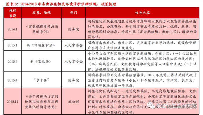 2015年到2016年,国务院相继颁布了《环保法》、“水十条”、“土十条”、《畜禽养殖禁养区划定技术指南》、《“十三五”生态环境保护规划》(下文简称《规划》)等,明确要求畜禽养殖场、养殖小区、定点屠宰企业等的选址、建设和管理应当符合有关法律法规规定。“土十条”中要求强化畜禽养殖污染防治,《规划》进一步提出2017年底前各地区依法关闭或搬迁禁养区内的畜禽养殖场(小区)和养殖专业户的目标。