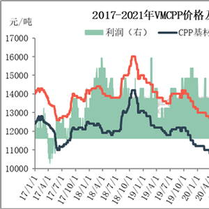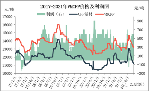 2017-2021年CPP镀铝膜最高价出现在2018年10月为16000元/吨,低价在2016年1月为12000元/吨,价差4000元/吨。