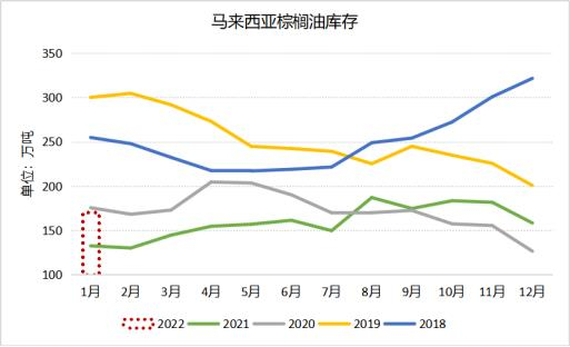 值得注意的是,近期盘面的连续上涨更多的是受到利多消息的刺激,但由于高频数据显示出口降幅远大于产量降幅,本月马棕库存或将较上年年末环比回升。如下表所示,按照SPPOMA给出的前20日-16.7%的产量降幅推算,本月马棕产量将定格在145万吨左右的水平,出口降幅取三家机构给出的中间值-38.4%,本月马棕出口或大幅下滑至87万吨上下,进口量和消费量按照过去六个月的平均值计算,据此推算1月马棕库存将回升至170万吨上方,环比增幅为7.64%,虽然该数字仅仅是根据前20日的增减幅推算,最终的库存水平不确定性仍然很大,但只要产量及出口降幅在本月最后十天不发生巨大变化,库存环比回升的趋势是相对确定的。与过去五年相比170万吨的库存水平仅高于2021年,仍处于同期偏低水平,然而在盘面价格已经涨至相对高位的当下,库存水平止降转升还能否支撑盘面价格进一步上攻?这是后期市场最大的风险点。