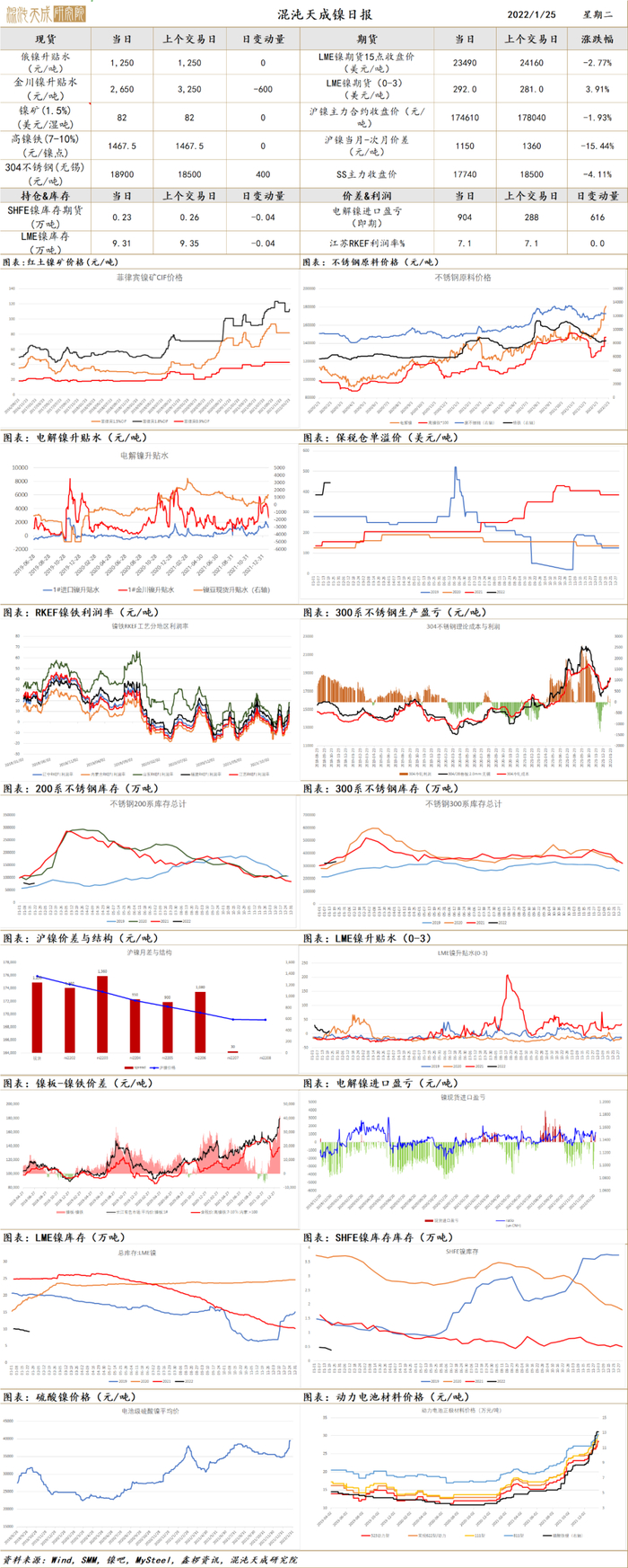 整体看,青山高冰镍的投产,减轻了硫酸镍原料的紧缺性,但短期供应量并不足以弥补电镍缺口,纯镍现货依旧偏紧,印尼政策拟对镍产品征收累进税,给供给释放带来诸多不确定性;春节将至,下游备库基本完成,不锈钢排产下滑,新能源依旧维持高景气;全球库存持续下滑,升水仍处同期高位,预计本轮暴跌后将有所企稳,短期不易过分看空,后续如何演绎需关注印尼高冰镍及规划湿法项目、镍铁产线在二季度过后能否顺利投产。