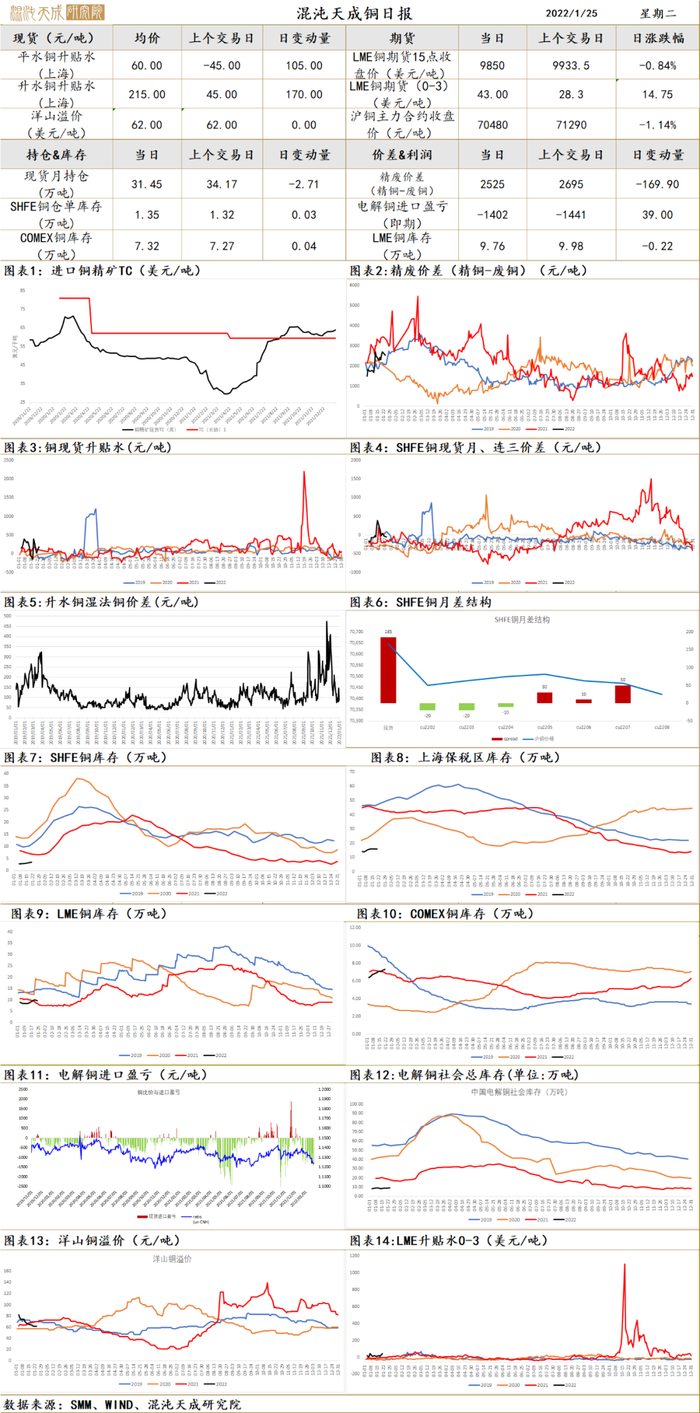 欧美与俄罗斯就乌克兰问题存在冲突升级可能,基于避险因素,市场风险偏好下降,VIX指数大幅上升,美元有所上行,欧美股市盘中大幅下行,昨日铜价显著回调 。