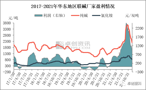 2021年在全球经济共振复苏及流动性充裕背景下,一季度大宗原材料价格普遍上涨,原盐、石灰石、煤炭价格也出现一定上涨,但成本涨幅不及纯碱市场价格涨幅,2021年纯碱厂家盈利能力较强,整体利润水平为近十年高位。以华东联碱厂家为例2021年纯碱及氯化铵市场价格重心较2020年均有明显提升,联碱厂家盈利水平较好,2021年华东地区联碱厂家生产成本在1940元/吨左右,平均双吨盈利1096元,较2020年同期大幅增长4284%。