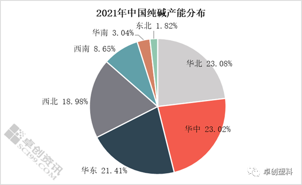2021年中国纯碱产能在3293万吨,较2020年底减少24万吨,同比下降0.72%。年内中盐内蒙古化工扩产2万吨至35万吨,宁夏日盛扩产10万吨至40万吨,江西晶昊共扩产24万吨至60万吨,加上甘肃金昌氨碱源纯碱装置搬迁后开车,纯碱产能共计增加56万吨。内蒙苏尼特及中海华邦纯碱装置停车时间较长,2021年确认装置淘汰,共计80吨产能。(2021年连云港碱业绝大多数时间为有效产能,因此2021年淘汰产能计算时不包含连云港碱业。)我国纯碱产能主要分布在华北、华中、华东、西北地区。