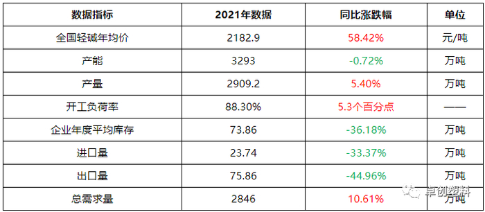 2021年供需格局改善,前三季度市场价格上涨为主,9月下旬全面突破三千大关,不断刷新历史高位,四季度市场价格高位回调。截至12月31日,轻碱主流出厂均价在2296元/吨,重碱主流送到终端价格在2500-2700元/吨。