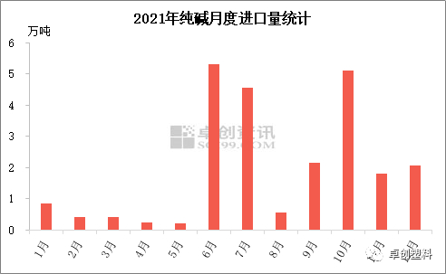 2021年全球经济复苏,国外需求好转,加上美国CINER从ANSAC退出,ANSAC纯碱货源供应偏紧,主要供应老客户为主,目前CINER国内代理为天辰和三广能源,土耳其CINER亦无多余计划量,因此国内进口量明显下降,中国海关总署数据显示:2021年进口量在23.74万吨,同比下降33.37%。2021年纯碱月度进口量分布不均匀,年内进口量主要集中在下半年。