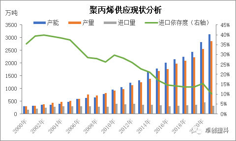 2021年中国PP仍处于新一轮产能扩张期,国内PP产能达到3131万吨,较2020年增长11.19%,虽然增速较2020年放缓,但仍处在高增长水平。随着产能的持续增长,产量亦较快增长,2021年PP产量2859.60万吨,较2020年增长11.95%,年内装置保持高负荷运行。2021年PP进口量较2020年显著下降,全年进口317.99万吨,较2020年下降26.97%,进口下降的背后一方面源于海外市场阶段性货源紧缺,区域价差扩大使得海外对华热情降低。另一方面,中国国内自给率提升,包括在中高端结构产品上自给率提升使得进口依存度下降,2021年中国PP进口依存度10%左右,较2020年下降5个百分点。