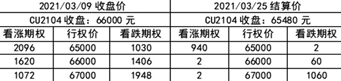 情形6:持平。2021年3月9日,铜2104合约报收于66000元/吨,当时期权价格如下表: