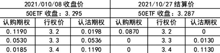 情形3:持平。2021年10月8日,50ETF报收于3.295元,当时期权价格如下表: