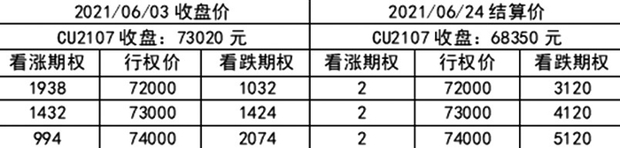 情形5:大跌。2021年6月3日,铜2107合约报收于73020元/吨,当时期权价格如下表: