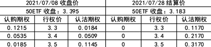 情形2:大跌。2021年7月8日,50ETF报收于3.395元,当时期权价格如下表: