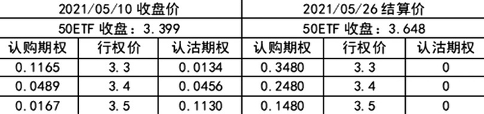 情形1:大涨。2021年5月10日,50ETF报收于3.399元,当时期权价格如下表: