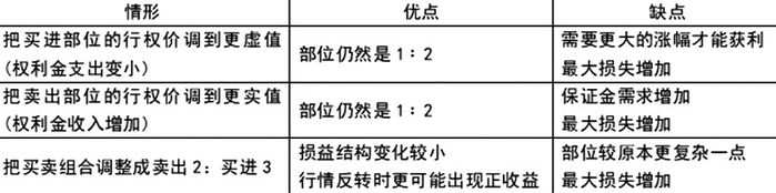 另外,由于我们是以卖出部位的权利金收入来减少买入部位的权利金支出,因此如果买入部位的权利金支出远大于卖出部位的权利金收入,造成入不敷出的情形,这时就需要把组合内容调整一下,各调整方式优缺点如下表: