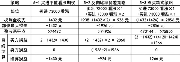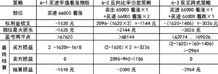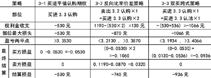 根据当时价格,分别试算买进平值认购期权、反向比率价差策略,以及双买跨式策略比较,结果如下: