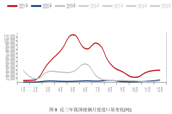 《再生钢铁原料》国家标准已于去年年初实施。另外2021年5月1日起,我国对生铁、粗钢、再生钢铁原料、铬铁等产品开始实行零进口税率。一定程度上使得铁元素的来源更加多元化。从2021年我国废钢的进口量来看同比有明显增加。1-12月累计进口废钢共计555539吨,是2020年全年的20倍,是2019年同期的3倍左右。尤其是5月单月进口量出现激增,是2019年以来的单月最高值。扩大进口资源的同时我国废钢资源产出速度也将加快,预计2025年我国废钢资源供应总量将达到3.4亿吨,对铁矿的替代效应将逐年增强。