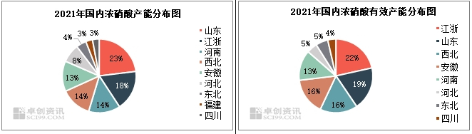 图 2 2021年国内浓硝酸产能及有效产能分布图