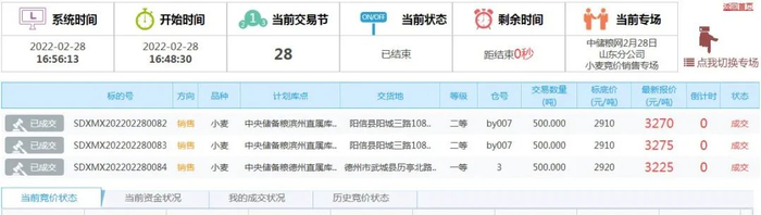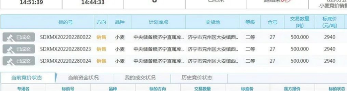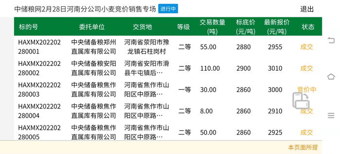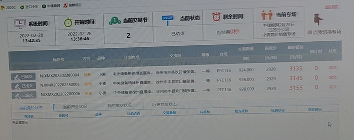 2月28日,中储粮江苏分公司计划销售2018年小麦5500吨,全部成交,底价2920,成交均价3131.8,最高价3155