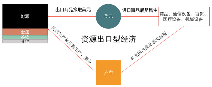 对于资源出口经济体来说,对外贸易主要是出口原材料类的优势资源换取美元,再通过美元进口其产业中的短板商品(较为分散)已满足国内生产生活需求,从而继续支撑原材料的生产,形成闭环。