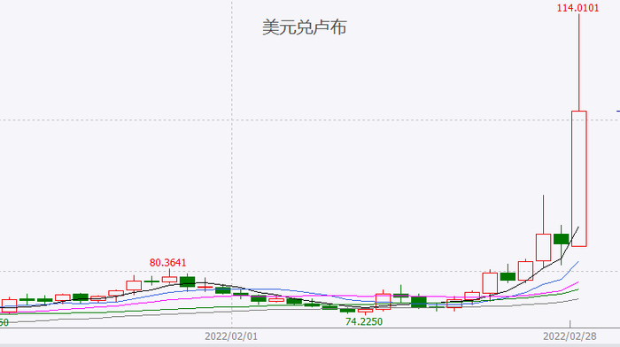 但一旦美元环节被阻断,直接冲击会首先波及卢布的外汇市场,导致卢布对美元大幅贬值。而因为主要的金融机构被SWIFT禁止后,对于离岸市场的结算和控制将会变得异常艰难,对汇率市场的干预几乎难以实现。