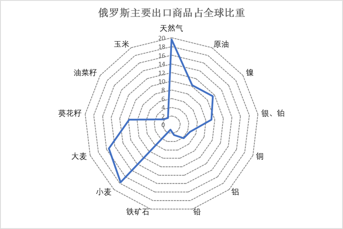 俄罗斯经济是以资源出口为导向的,其中,能源出口占俄罗斯GDP近一半。在重要的对外出口商品中,天然气、原油、镍、银和铂、铜、小麦、大麦、葵花籽在全球份额占比都近10%或超过10%,特别是天然气(近20%)和小麦(近18%)。