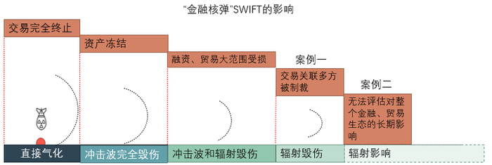 SWIFT制裁包括一篮子制裁,目标是阻断被制裁对象的交易、冻结部分权益类资产和外汇储备、禁止其在国际市场融资。而这些制裁一旦最终被执行,会具备极大的扩散效应。为了让读者更清晰的理解“扩散性”,笔者举两个例子。2012年香港某银行涉嫌参与被制裁对象朝鲜的交易,最终该银行交付19.2亿美元与美国财政部达成和解;2018年12月1日,加拿大警方毫无根据逮捕了中国某龙头企业的副董事长兼首席财务官某女士,理由是该公司涉嫌违反美国技术出口管制条例,向被制裁对象伊朗出售所谓的“敏感科技”,该女士就被“空气罪”控制人身自由1028天。而上述案例一仅处在“交易关联方(辐射毁伤区)”,案例二则处在最边缘的“生态区域(辐射影响区)”,见下图: