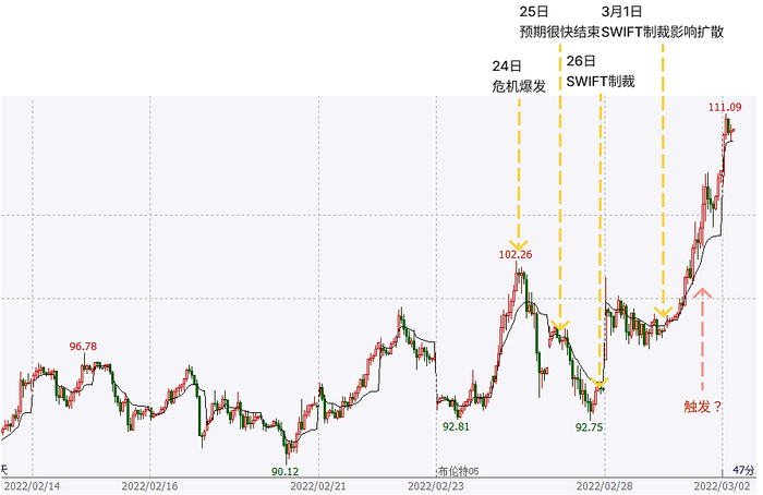 以布伦特原油期货主连作为标的分析,自2月24日国际局势事件发生以来,原油的价格波动共经历了四个明显的标志时间点。