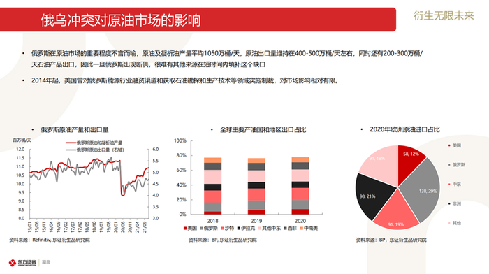 回顾过去40年油价历史,一直在对地缘冲突做出反应。扰乱供应或增加未来石油供应不确定性的事件往往会推高油价。俄罗斯的原油产量与出口量在全球占比相当大,随着俄乌冲突,一旦俄罗斯出现断供,短时间很难填补缺口。而西方国家对俄罗斯的制裁导致原油的风险溢价大幅上升,俄罗斯与西方一旦出现这种裂痕,这种风险溢价不太可能快速回到冲突之前的水平。