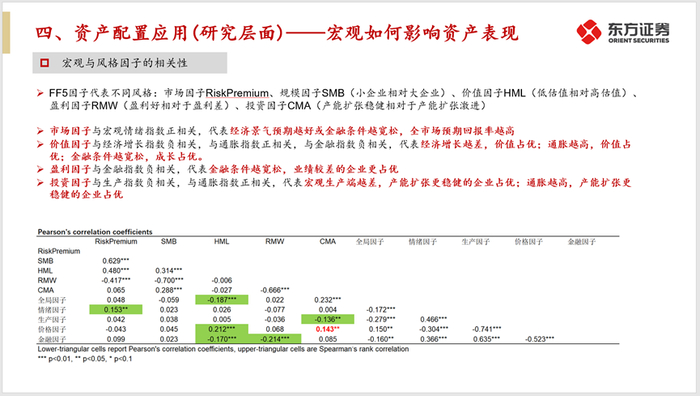 三是在应用于资产配置研究。基于模型构造的宏观指数,总结宏观经济如何影响资产表现,包括大类资产、风格因子等。例如,价值因子HML与经济增长指数负相关,与通胀指数正相关,与金融指数负相关,代表经济增长越差,价值占优;通胀越高,价值占优;金融条件越宽松,成长占优。结合经济预测和周期指数的情况,这也解释了为什么当前价值防御风格占优。