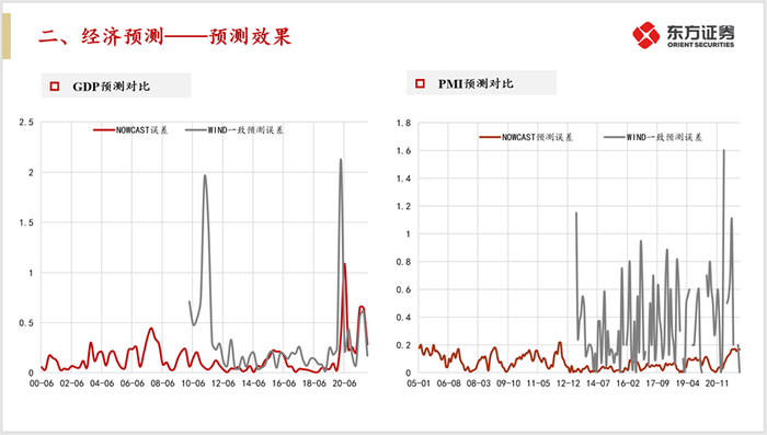 一是对主要经济指标进行预测,包括单月GDP预测、季度GDP预测、消费、投资、通胀、生产等主要数据的临近预测。在预测表现上,部分重要经济指标的预测较为稳定,如GDP和PMI的绝对误差好于WIND一致预测的误差。当前的经济预测显示,预计三月份房地产投资、固定资产投资等重要的需求端数据将出现好转。总体而言,经济企稳的转换时点可能在3月份前后,具体经济数据的公布时间预计在4月中上旬。