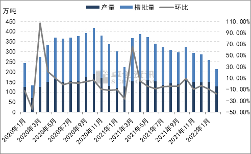 其次重要的一个影响因素是供应方面,春节过后LNG工厂开工负荷暂未得到迅速提升,而且部分接收站库存不高对外出货有所限量。2月国内LNG供应量为213.3万吨,环比减少44.57万吨,降幅约为17.28%。国内LNG的供应包括国产LNG供应和进口LNG供应。国产LNG产量方面,春节后复工较为缓慢,新疆、四川、山西等LNG主产区的开工负荷环比年前下降,国产供应量环比减少。进口LNG的槽批供应也是呈现减少趋势。