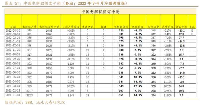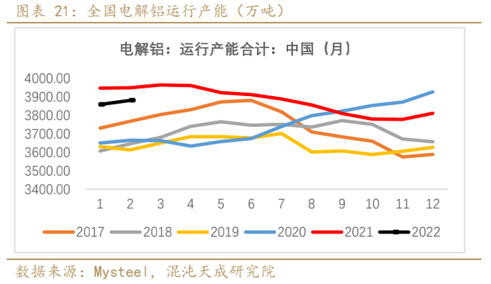 根据Mysteel,2022年2月中国电解铝运行产能3880.9万吨,环比1月(3858.9万吨)增加22万吨,同比去年2月(3949.4万吨)减少68.5万吨(1.7%)。今年云南电力紧张缓解,复产进度超预期,3月开始新投产。预计全国3月底电解铝运行产能将达到3978万吨,4月底达4033万吨。