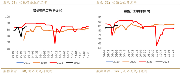 c) 本周铝板带开工率84%,环比持平;铝箔开工率85.6%,环比持平。