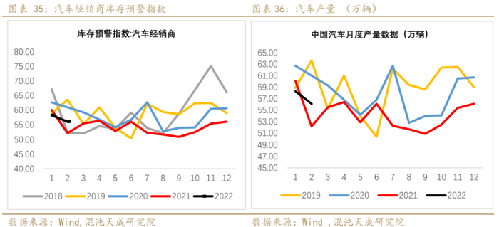 2)、汽车:22年2月汽车库存预警指数降至56.1,库存压力同比偏低。汽车轻量化需求的增加及传统汽车、新能源汽车产量的提升将进一步拉动汽车用铝需求。需注意,俄乌冲突对芯片供应、俄罗斯汽车生产均造成影响。据路透报道,由于俄乌关系持续紧张,乌克兰两家主要氖气(制造芯片的关键原材料)供应商已经停止运营,这两家公司的氖气产量在全球供应中约占一半。当前部分产业链公司如美国电子特气公司、华特气体表示目前备库充足,预计不会对今年产量造成干扰。需持续关注后期芯片短缺问题是否因俄乌冲突而加剧,从而影响全球汽车生产。