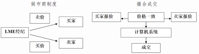 LME的场内交易、场外交易都是采用典型的做市商制度,圈内会员可以根据市场自行报价,因此导致不同的会员有不同报价,包括3M和调期的价格都有不同。LME的电子盘采用的是撮合成交方式。