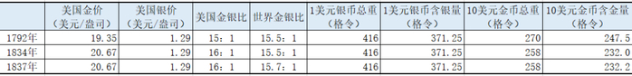 1792年,美国国会通过《铸币法案》,采用金银复本位制,金币和银币都是法定货币(法定货币还包括西班牙银圆)。其中,金价为19.35美元/盎司,银价为1.29美元/盎司,金银比价为15:1。1美元等于416格令银币,含银371.25格令;1美元等于24.75格令纯金。当时全球市场金银比价为15.5:1,美国黄金价格低估,造成大量黄金流出,金银复本位实际上变成银本位。