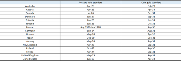 1930 年代的大萧条充分暴露了金本位制的缺陷。英国 1925 年恢复金本位,到 1931 年再退出,是这段时间英国经济收缩的重要原因,大萧条程度更为严重。美国于 1933 年、法国于1936 年相继退出。