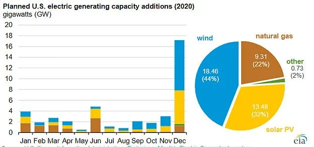 新增的发电容量中,主要是太阳能(44%)和风能(32%)。这里可以看一下,天然气的发电容量还是净增加了5.57GW的。