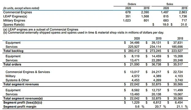 注意,这部分的利润率在正常情况下是很高的,可以达到20%左右。即便是疫情年,还是赚钱了,利润率为5.6%。2020年尽管商业发动机的订单数量减少72%,销量减少48%,但军用发动机的订单数同比增加了27.7%,虽然销量下滑了4.8%。