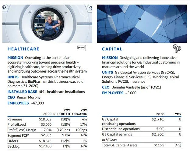 GE资本是赔钱最为严重的,利润率公司可能都不好意思算了。2018,2019,和2020年利润率分别为-9.89%,-10.82%,-43.3%。去年业绩严重下滑和GECAS(航空租赁)板块由盈转亏有关。GE资本的长期护理保险是一个神坑,这个我们在后面再说。