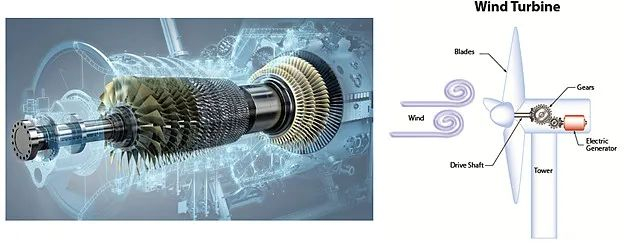 左图为一个燃气轮机,右边为风机。燃气轮机分三部分组成:上游是一个气体压缩机(Gas Compressor),中游是一个燃烧室(Combustor),下游是一个涡轮(turbine),和空气压缩机是在同一个水平线上的。因为又是高压,又是高温,所以到了一定寿命之后就得时不时检修;风机呢,主要是大风吹来把机械能转换成动能,虽然海上风机可能要面临较为恶劣的气候环境,但总体经营环境比起燃气轮机还是要好很多的,所以其所需服务非常少。这对新能源的降本是好事,但对风机制造商就是噩耗了。