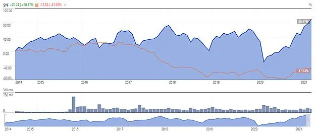 同步金融公司股价涨了90%,而GE的股价下跌46%... …
