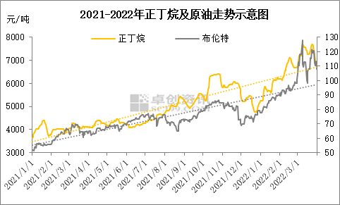 2022年一季度,正丁烷均价6611元/吨,同比去年上涨了63.21%,与2021年四季度相比,价格上涨了15.96%,突破了2018年9月份的价格高点,并达到2015年(历史数据可溯)以来价格峰值。本轮上行动力主要来自原油价格的突破,从成本到心态对正丁烷市场均是强力提振。从2021年全年价格数据来看,正丁烷与原油价格的相关系数达到0.83,相关性明显。不过从趋势线来看,正丁烷后期涨势偏强。
