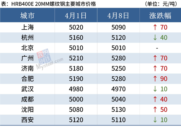 据Mysteel监测,截至4月8日,全国主要城市20mm三级抗震螺纹钢均价5129元/吨,周环比上涨24元/吨;8.0mmHPB300高线均价5339元/吨,周环比上涨36元/吨。
