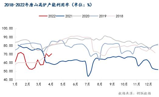 高炉生产情况:唐山地区126座高炉中有57座检修(含长期停产),检修高炉容积合计40620m³;周影响产量约94.56万吨,周度产能利用率为70.31%,周环比上升3.04%,月环比上升12.99%,年同比上升12.48%。本周调研周期内,唐山辖区各地陆续解封,交通管制逐步解除加之钢企均办理了相关通行证,原料库存压力得以缓解,部分钢企高炉陆续复产,高炉开工率及产能利用率上升明显,由于目前唐山疫情得到了有效控制,后期运力问题将会得到进一步缓解,因此后期高炉产能利用率降保持上升趋势。