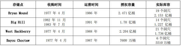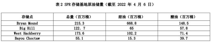 美国的SPR主要存储在最大的炼化基地美墨湾,共有四个主要的存储基地,分别是德克萨斯Bryan Mound 、 Big Hill和路易斯安那州的(West Hackberry and Bayou Choctaw)。截至2022年4月6日,四个基地存储容量为7.134亿桶。