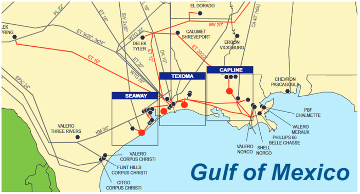 SPR还连接到三个海运码头,这些码头的合同海运配送能力合计为222万桶/天,这些海运码头是 德州自由港Seaway Terminal (Enterprise Products)、德州德克萨斯城Seaway Terminal (Enterprise Products);德州荷兰城Energy Transfer Terminal;以及DOE拥有的路易斯安那州圣路易斯郡St. James Terminal。