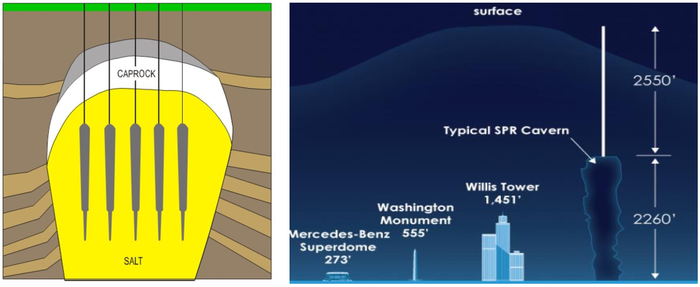 SPR存储在盐洞中,这些盐洞具有良好的存储特性:通常不透液体和气体,对石油呈惰性;抗压强度可与混凝土相媲美;塑性变形特性,自动密封初期裂缝;并且可以很容易地通过用淡水溶解(浸出)来开采。洞穴的容量从 6 到 3700 万桶不等,典型的洞穴是圆柱形的,平均直径约为 60.96米,高度为777.24米,位于地表以下 609.6米-1219.2米。这些盐洞是通过“溶液开采法”形成的:在盐层中钻一口井,然后注入淡水,通过溶解盐层形成洞穴,可以创建尺寸非常精确的洞穴,提取也非常方便,直接将淡水泵入洞穴底部,原油因密度低于水,则会置换到上层,然后通过管道抽取即可。