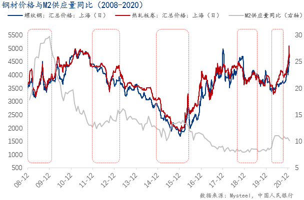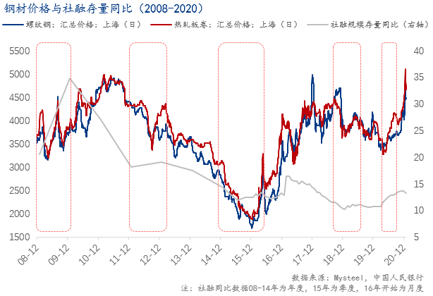 在这五轮稳增长中,比较大型的稳增长有三次,分别为08-09年、15-16年及20年。在这三次大型的稳增长中,市场也都迎来了金融市场的牛市,钢材价格也跟随市场的复苏及量化宽松而集体迎来较长时间的上升期。因此,本文将对这三次大型的稳增长下的市场做一个简单的分析。