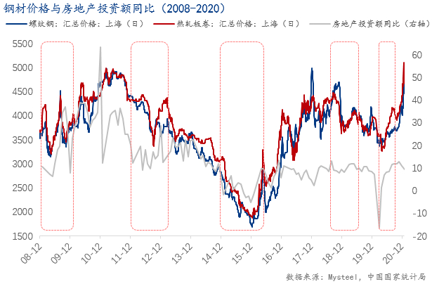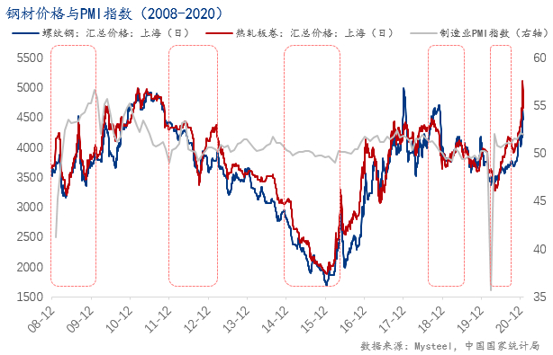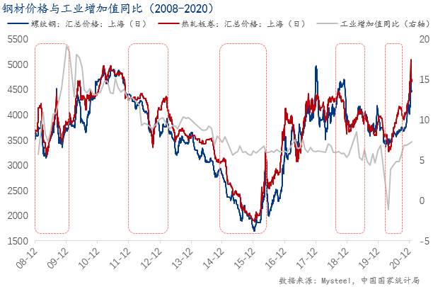 在19年末中央经济工作会议中,国际强调了20年作为“十三五”收官之年,但经济下行压力增大,要落实以“稳”字开头的经济发展,而20年随着全球疫情爆发,疫情对国内经济的冲击令人担忧,同时也让大众对于眼下的经济发展惶恐不安。面对这样一件让全国大部分企业暂时停摆的黑天鹅事件,为了调节市场对于疫情恐慌的心态,中国随即开展在疫情突发前已规划的第三轮稳增长政策。此轮稳增长的预热期及发力期时间间隔较短,尽管疫情仍在部分地区不时扰动,但金融市场以及现货市场的参与者的信心与决心较充足。在金融环境表现优异的情况下,钢材价格仅经历了较短时间的潜伏期便迎来了上涨。此轮稳增长钢材价格高点出现在20年8月,螺纹钢当月均价为3695.7元/吨,较拐点期3481.8元/吨上涨6.14%;热卷当月均价为4141.4元/吨,较拐点期3526.8元/吨上涨幅度高达17.43%。本轮钢材价格上涨同样存在客观的基本面因素,20年3月开始,铁矿石及焦煤等原材料急剧上涨,拉动了钢厂生产成本,钢厂只好推涨成材价格。另外,全球为了应对疫情带来的不利影响,美国英国等经济强国均实施了超宽松的货币政策,也导致了海外大宗商品价格的集体上涨。此轮稳增长政策依然发挥了举足轻重的作用,从各项经济指标来看,制造业PMI指数在经历疫情造成的历史性的新低后,在4月迅速回归到荣枯线上方;工业增加值同比以及房地产投资额同比同样迎来迅速回升,强势走出了低谷。综合来看,疫情发生后,在稳增长的发力下,制造业和建筑业的复苏带动了需求端的振奋,进而带动了钢材价格的攀升,因此事后来看,本轮稳增长不但在黑天鹅事件下解决了燃眉之急,效果更是立竿见影。
